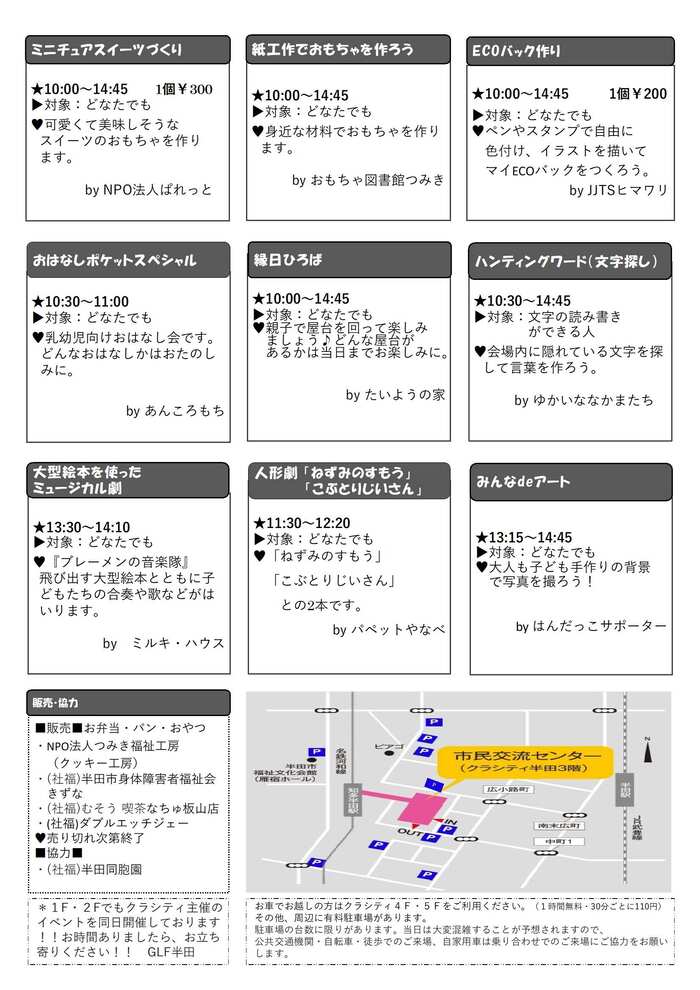 各子育て支援団体が、日頃活動している内容(人形劇・おもちゃ作り・読み聞かせなど)をはんだこそだてフェスタに合わせて特別に企画したものです。